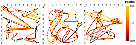 The -optimum trajectories were computed and plotted in Figure 7. The black dots mark the discrete trajectory points and correspond to the 1 Hz sampling rate, while the smooth lines in-between the dots are their 3rd-order spline interpolations. It is clear that these trajectories are indeed trivial in the sense that they are too erratic to be reasonable, physical and useful. This confirms the necessity of the proposed multicriterial optimization approach. The geometric criterion can be used to balance and alleviate the detrimental influence of all involved errors (measurement errors, sensor nonlinearities, modeling errors, etc.) and the limited availability of information.