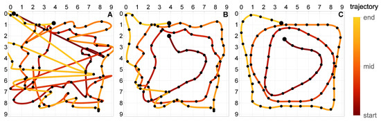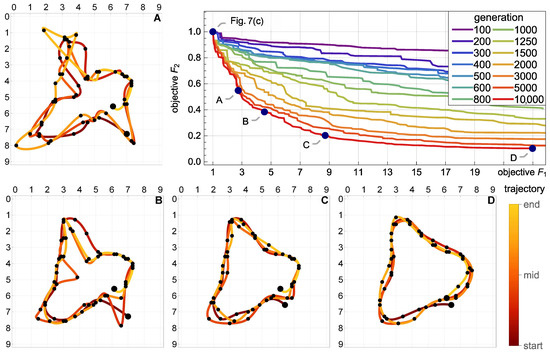 Given the erratic nature of the trivial trajectories, the proposed multicriterial optimization scheme was applied to balance against the geometric objective and to determine the Pareto front. Up to 10,000 generations were evolved. Figure 8, Figure 9 and Figure 10 present the results obtained for the square, circle, and triangle trajectory, respectively. In its top right part, each figure shows the advancement of the Pareto front in the course of the optimization process. Dark blue dots mark five specific trajectories along the final Pareto front. The top left dot corresponds to the respective trivial trajectory, based on only and shown in Figure 7. The successive trajectories along the Pareto front (denoted by A, B, C, and D) illustrate the increasing influence of the objective and the effect of the geometric regularization it imposes on the solution. These trajectories are shown to the left and below the Pareto plots in Figure 8, Figure 9 and Figure 10. The actual trajectories of the line-follower robot are shown in Figure 2: in each case, their important characteristics were reasonably faithfully identified. It can be seen that at least a qualitative identification of the trajectory was clearly possible.