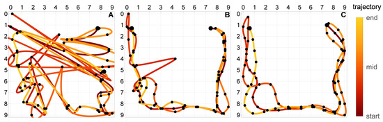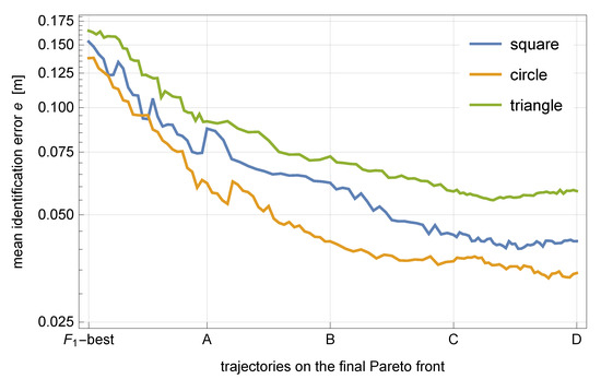 The proposed multicriterial identification approach was applied to identify these two trajectories based on the constructed sensor responses. The final Pareto fronts obtained from the NSGA-II are plotted in Figure 13. Three specific points on each Pareto front are labeled “A”, “B”, and “C”, and the corresponding identified trajectories are shown in Figure 14 and Figure 15. The mean identification error, defined in Equation (14), was calculated for all identified trajectories, along both Pareto fronts, and plotted in Figure 16. Similarly as in the case of the three basic trajectories, the proposed approach properly identified qualitative characteristics of both compound trajectories. In quantitative terms, the geometric regularity criterion decreased the mean identification error to the level of 40 mm to 60 mm.