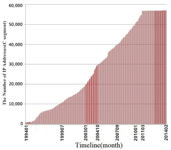 - CERNIC. Statistics of IPv4 Addresses Assigned by CERNET (1994–2014). Technical Report, CERNET. 2014. Available online: http://www.edu.cn/szkfz_12718/20141105/t20141105_1198820.shtml (accessed on 5 November 2014).