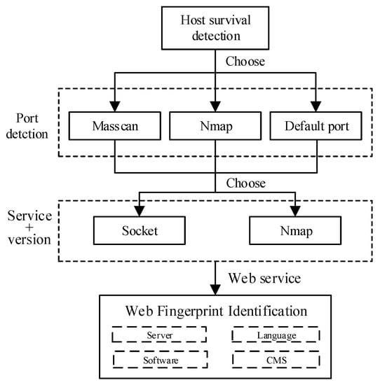 As described in Section 2.1, network asset detection can be divided into passive detection and active detection. Passive detection for network assets depends on deploying probes in stem paths that are difficult for complicated campus networks. The performance of passive detection is far away from active detection considering comprehensiveness and efficiency. After considering the timeliness and accuracy of detection, WebHunt uses active detection to identify assets. The process is shown in Figure 4. Three functions of asset identification are described below.