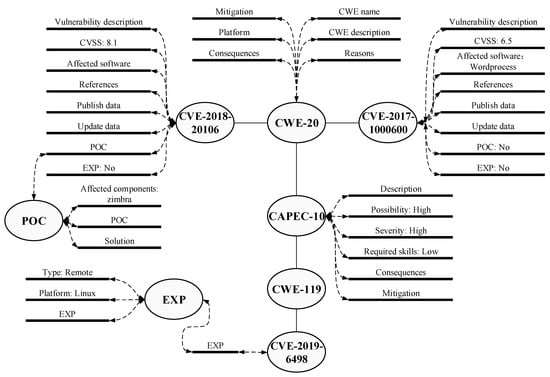 Network assets’ vulnerability in campus networks can be divided into code defects in self-developed software programs and the vulnerabilities from third-party components. Vulnerabilities caused by code defects, such as SQL injection and cross-site scripting attacks in self-developed software systems, can be detected by the Web application vulnerability scanner. For the unrepaired vulnerabilities that have been made public on the Internet in the campus network, vulnerability scanning technology was developed built on the vulnerability knowledge graph in WebHunt. By matching network assets information and the local vulnerability database, the vulnerabilities are found, and WebHunt estimates further whether they can be attacked or exploited. WebHunt establishes and maintains a local vulnerability database that stores multi-dimension vulnerability information, including CVE, CWE, CAPEC, POC and EXP. These data sources are shown in Table 7, and one example of a vulnerability description is shown in Figure 5.