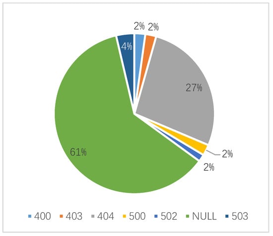 For Wuhan University, the domain name’s resolution rate is 98%, which the resolution rate of domain name belongs to CERNET is 99.7%, and the resolution rate of the public network was 75.6%. The proportion of domain names belongs to CERNET and public networks that normally access is 76.2% and 48.8%, respectively. The difference between the two sets of data above indicates that some domain names access error. WebHunt obtains the corresponding IP addresses and classifies them according to the HTTP status code returned. As shown in Figure 6, the error codes of 400, 403, 404, 500, 502, 503 and NULL are found for Wuhan University. As known from the error code distribution, the access errors contain both client side and server side. not only client side but also server side error and cannot process requests normally. Through analysis of detection results, HUST and CUG have the same error exist.