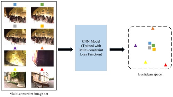 where is the predefined hyperparameter, and can be randomly selected from the negative image set with . As mentioned before, there is only a single image from each place in . Therefore, and are from different places. In a multi-constraint image set, the distance constraints can be converted to the minimization problem of the following objective,