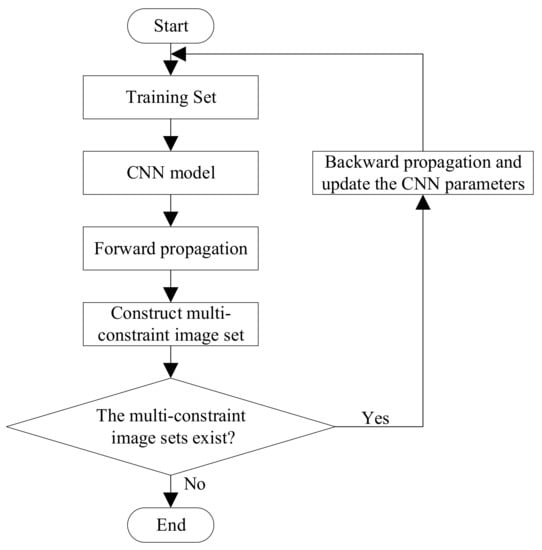 The diagram of the training process is shown in Figure 4. First, we divide the training set into several mini-batches with the size of (A + B). These mini-batches are input into CNN models which share parameters updated by the multi-constraint loss function. In this way, feature vector of each image can be derived by forward propagation. Then, we can construct suitable multi-constraint image sets according to the Algorithm 1. If there exist multi-constraint image sets, we will update the parameters of the CNN model using the multi-constraint loss function. If there isn’t any multi-constraint image set existing, the training process ends and it means the CNN is successfully trained.