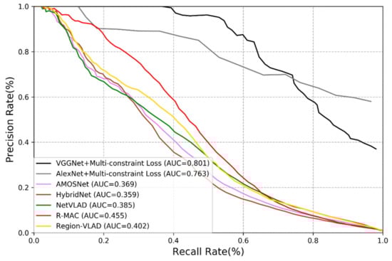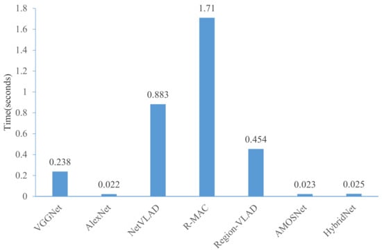 In this part, the superior of the proposed method for real-time inference is described. First, we compare the average processing time for feature extraction. Given a single query image, the feature extraction time for all visual place recognition techniques is shown in Figure 13. As expected, AlexNet, AMOSNet and HybridNet show the best performance because of the lightweight network structure. The results also indicate that the proposed framework no matter with AlexNet or VGGNet is much more efficient. For AlexNet with multi-constraint loss, the average time reduces to 0.022 s per image pair, almost 77 times faster than that of the R-MAC method. It is noted that in the proposed method, the feature extraction time is only related to the feature extraction network used, and it has nothing to do with the loss function used during training and the dimension of feature vectors. In the future, we may design a faster and more lightweight network model to further reduce the feature extraction time.