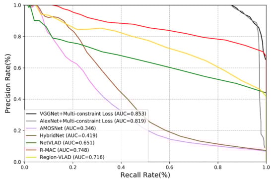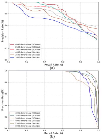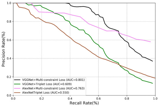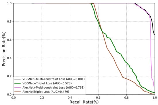 In this section, we present the experimental results of our method and compare them with those of the triplet loss method [33,34,35]. We carry out comparison on VGGNet and AlexNet using the same experimental steps and network model. The results are shown in Figure 7 and Figure 8.