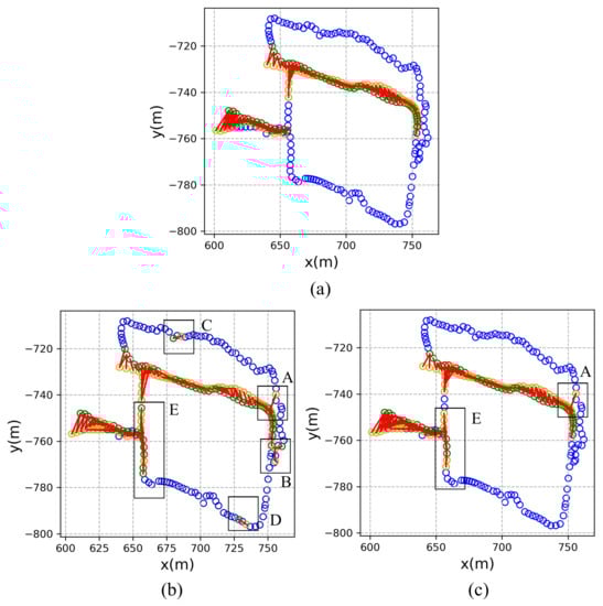 The places recognized by triplet loss and multi-constraint loss are shown in Figure 9b,c, respectively. The results indicate that most of the closed loops can be detected by the proposed method on the New College dataset. It is clearly shown from the visualization that there exist false detected closed loops. In Figure 9b, the results using triplet loss show many false detected closed loops located in area A, B, C, D and E, which indicates unreliable of using the triplet loss in visual place recognition. While in Figure 9c the false detected closed loops can only be found in area A and E.