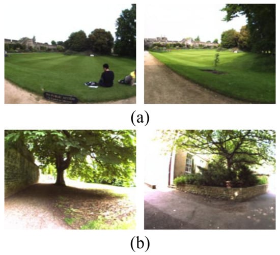 Therefore, we carry out a thorough analysis of the New College dataset to find out the reasons for the false recognized places. The images in area E were taken continuously along a straight road. Figure 10a shows a representative false detected closed loop in area E. These two images are similar in that they contain a large lawn and the same houses in the distance. But they were not shot in the same location. There are many similar situations in area E. It is a hard task for the existing methods to distinguish whether it’s a revisited place or not. Figure 10b shows another example of a false recognized place in area A. These two images contain lots of leaves and shadows, which lead to strong condition variations that both methods are easily confused to have a revisited place.