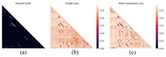 Visualization of the distance matrices. (a) The ground truth of the New College dataset. (b) The triplet loss. (c) The multi-constraint loss.