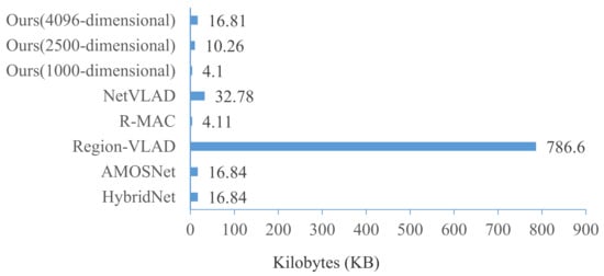 Although the performance of visual place recognition can be improved as the feature dimension increases, it may not applicable for real-time inference of visual place recognition tasks. It is of great significance to have a compact feature vector due to the limited resources of the embedded vSLAM systems. The feature vector sizes of different methods are compared in Figure 15. It is interesting to note that Region-VLAD suffers from a significantly higher feature vector size. In the AMOSNet and HybridNet methods, the size of the feature map after feature extraction is (256, 13, 13). In the R-MAC method, the size of the feature vector of each image is 512. In the NetVLAD method, the size of the feature map after feature extraction is 4096. In Figure 15, the feature vector size of our method with 1000-dimensional is the smallest.