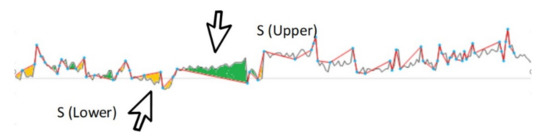 When a VR is applied to data, a difference between the graphs of inferred data versus the graph of original data will inevitably arise, as depicted in Figure 2. In this figure, S (Upper) represents the area of this difference or the distorted portion by the inferred values that are less than the original, whilst S (Lower) represents the areas of inferred values that are higher than the original. A larger total area of the gap refers to greater data distortion and, therefore, reducing this gap would imply better accuracy. The formula below depicts the area of upper and lower sides of the inferred graph against the original.