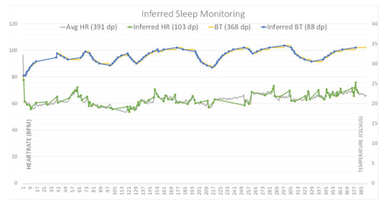 Inferred heart rate (HR) and body temperature (BT) of sleep monitoring data (based on sampled by minutes)–inferred BT data represents the original well whilst inferred HR data shows relatively more gaps (this could be improved by using beacon data sampling).