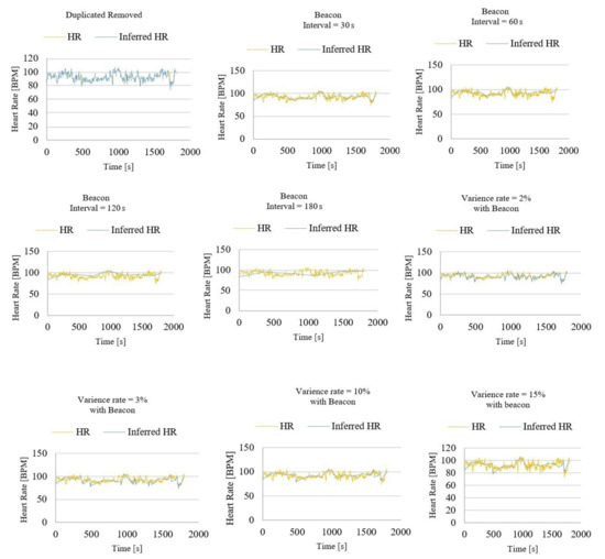 Figure 4 shows HR and inferred HR from case 1 to case 9. According to the experimental results, it is observed that, as the sampling interval increases, SR becomes larger, but AR becomes smaller. Moreover, as the value of VR becomes larger, SR becomes larger, but AR becomes smaller. In addition, when data inference is performed by combining time sampling (collecting beacon points) inference and VR inference, when the sampling interval is constant, the larger the VR, the more significant the AR improvement that is brought by the combined method.