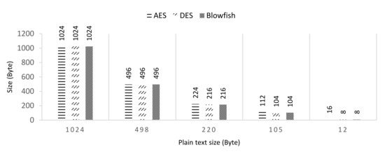 This section aims to study the efficiency of the proposed scheme from a privacy preservation perspective. Research on privacy-preserving approaches in eHealth clouds have commonly tended to focus on cryptographic methods, such as symmetric key encryption (SKE) and attribute-based encryption (ABE) [24,28]. In order to prove the efficiency of the proposed data inference framework for IoHT, the correlation between the plaintext size and crypto texts size can be tested in two main categories: SKE and ABE. For SKE evaluation, the simulation is conducted in OnlineDomain-Tools [29] for three main symmetric encryption techniques: advanced encryption standard (AES), data encryption standard (DES), and blowfish.