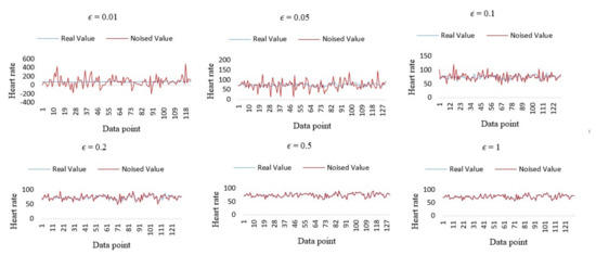 The Laplace (∆f/) is the Laplace noise which was added to protect the real data. According to Equation (14), the sensitivity of our query algorithm is first required to be analyzed, from which, an appropriate to obtain the required Laplace noise is selected. By definition of sensitivity, it is logical to infer that the greater the sensitivity, the greater the noise, and the smaller the sensitivity, the smaller the noise. An assumption is made that ∆f = 1 (that is, the addition of each new record will cause the result to change by 1, which is very large). Therefore, the following experiments are conducted with a sensitivity of 1 (∆f = 1), and the distribution of Laplace noise that is added to the data is equal to Laplace (1/). Noise is added in order to satisfy the Laplace (1/) distribution to each heart rate data in the original data set. Six experiments were performed, where was set equal to 0.01, 0.05, 0.1, 0.2, 0.5, 1.0, and the results are compared to observe how differential privacy protects the original data. Following this, the average values of the original data were identified and compared with the original data statistics in order to compare the performance of differential privacy.