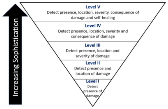 The process of selecting sensors to monitor concrete structures’ structural integrity depends on the material properties, environment, age, and purpose of the structure and surface treatments []. For example, electrochemical sensors are appropriate for steel and metallic structures, while wireless, ultrasonic, piezoelectric, and temperature sensors are suitable for concrete structures [,]. Apart from the material characteristics, the identification of suitable sensors is also predicted by the level of sophistication, as shown in Figure 4. Highly sophisticated sensors provide a more reliable diagnosis of the health of the farm structures. In contrast, a decrease in sophistication translates to less accuracy—the increased sophistication reported by Mccarter and Vennesland [] and Ha et al. [] is consistent with Cawley’s [] classification of structural health monitoring systems into machine condition monitoring, the global monitoring of large structures, detection of localized damage such as cracks and corrosion, monitoring of damage over large areas, and the global monitoring of large structures. Localized damage monitoring requires a higher number of sensors compared to machine learning conditions, resulting in limited specialist commercial applications.