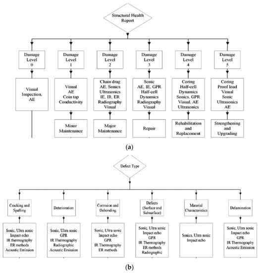 (a,b) Selection criteria for sensors based on the type of defect, level of damage, and repairs [].