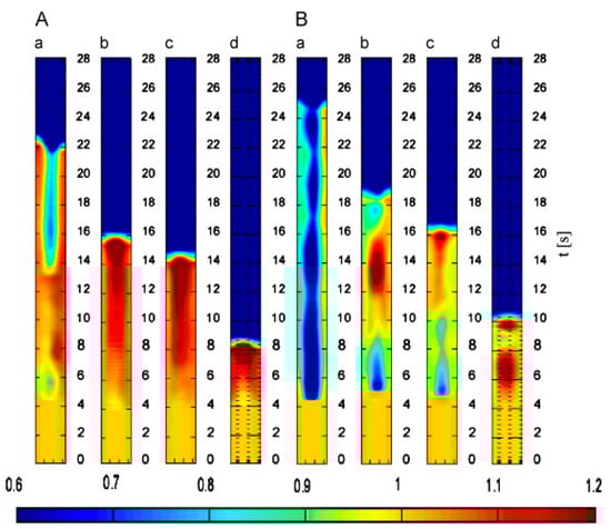 The electrochemical sensor technology also forms the foundation for electrical capacitance tomography (ECT)—a reliable technology for real-time monitoring of granular changes in silos []. Niedostatkiewicz et al. [] reported the utility of ECT in determining the changes in permittivity—with an accuracy of 3–5%. On the downside, the technique’s accuracy was proportional to the electrical conductivity of the target materials. Lower electrical conductivity translates to better measurements. The thermal imagery of the granular distribution in different silos is shown in Figure 6. Considering that the silos under investigation were loaded with sand, it would be interesting to determine whether similar observations would be made in agricultural silos. Recent studies suggest that the technology was appropriate for structural health monitoring of silos that store agricultural produce, especially in solid grain form. Both Grudzien et al. [] and Zurovec et al. [] monitored granular flow changes in corn and wheat silos using ECT; it was deduced that the technique was appropriate to help obtain critical information about the behavior of bulk solids.