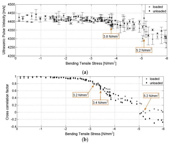 Ultrasonic pulse velocity (USPV) (a), cross-correlation factor of signals from cyclic loading/unloading (b) [].