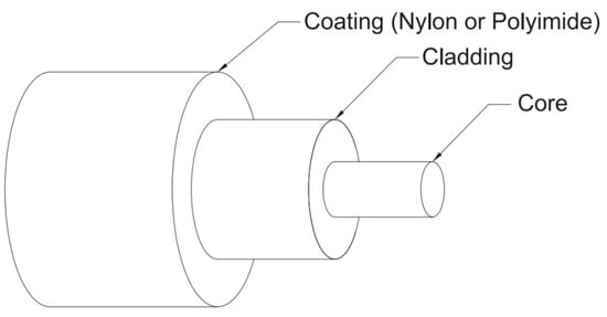 Various types of fiber optic sensors have been deployed for structural health monitoring applications []. The most effective include evanescent field-fiber loop ring-down (EF-FLRD) techniques [], optical [], and distributed fiber optic strain sensors [] for water and moisture detection in concrete. As noted in the preceding sections, the choice of the sensors is predicted by the functionality, application, and reliability. For example, EF-FLRD is a reliable technique for measuring the changes in the water and moisture content—the feature is augmented by the high reversibility in water–dry–water–dry duty cycles and detection sensitivity limit (approximately 0.12 mL) []. The unique benefits associated with EF-FLRD justify the choice of the sensor in place of polymer-coated fiber Bragg grating (FBG) water sensors. The accuracy of the fiber optic sensors is attributed to the configuration of the components depicted in Figure 9. The main components include coating, cladding, and the core (source of light transmission) []. The cladding component helps to convert the core into a waveguide, while the polyimide or nylon coating offers protection and resistance against the applied forces.