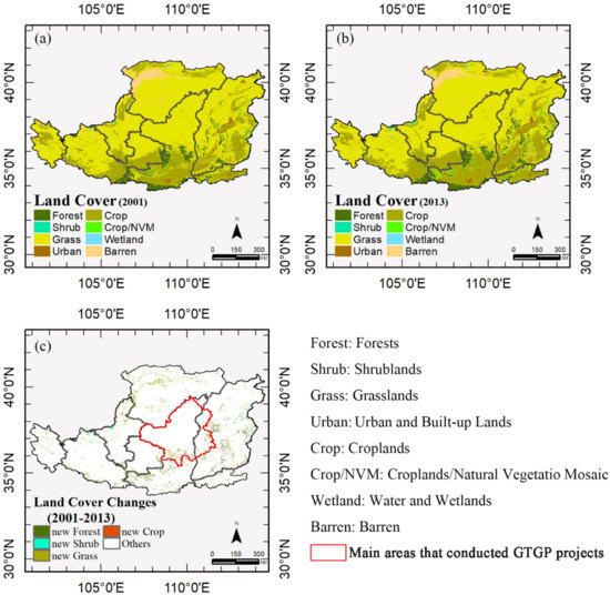 Land cover types in (a) 2001, (b) 2013, and (c) between 2001 and 2013 (only showing the new forests, shrublands, grasslands, and croplands). The red boundary indicates the outline of the main areas of the counties that implement the Grain to Green Program (GTGP).
