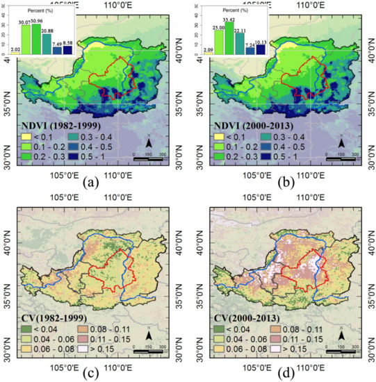 Spatial distribution of long-term averaged vegetation greenness and the coefficient of variation (CV) of vegetation greenness: (a,c) 1982–1999, (b,d) 2000–2013. The red boundary indicates the outline of the main areas of the counties that implemented the Grain to Green Program (GTGP). The blue line is the Yellow River. The smaller images in (a,b) shown the area percentages of each classes demonstrated in the large one.