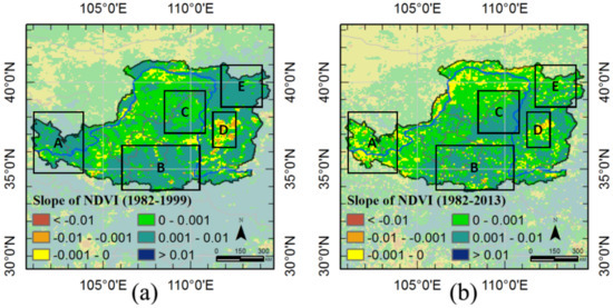 Vegetation greenness change tendency: (a) normalized difference vegetation index (NDVI) (1982–1999), (b) NDVI (1982–2013).