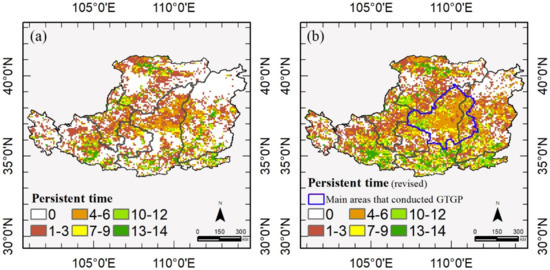 The PT map of the Loess Plateau using 1982–1999 as the reference period is shown in Figure 6. High PT indicates vegetation greening and short recovery time, and zero indicates vegetation degraded or still not recovered from disturbances. The revised first-passage statistic is more sensitive than the first-passage statistic (Figure 6a), as demonstrated by more details (fewer zeros) in Figure 6b. High PT values occurred in the southern Loess Plateau, and the Hetao Plain, which were characterized by croplands (irrigated agriculture) or forests. Vegetation greening ceased in northeast of the Loess Plateau. Large clusters of low persistence of vegetation greening could clearly be observed within the main areas that participated in GTGP.