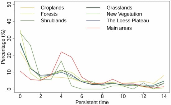 In the long-time, the degradation of vegetation is more severe over the Loess Plateau, especially in the northeast areas. The PT of vegetation greening represents the recovery time of vegetation from disturbance. Our results indicated that low persistence values dominated the Loess Plateau. Indeed, previous studies concluded that vegetation in some mountains, including Liupan Mountains and Qinling Mountains, decreased [59]. However, croplands show high PT, because they have a relative high soil water content and soil water storage compared to grasslands and shrublands [60].