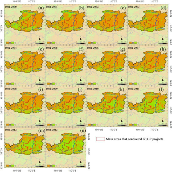 Persistence maps for the Loess Plateau over the period of 1982 to (a) 2000, (b) 2001, (c) 2002, (d) 2003, (e) 2004, (f) 2005, (g) 2006, (h) 2007, (i) 2008, (j) 2009, (k) 2010, (l) 2011, (m) 2012, and (n) 2013 compared with the reference period (1982–1999) using the revised first-passage statistic. Areas designated by 1 are those where the vegetation greening persisted, 0 indicates that vegetation greening ceased.