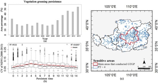 (a) Percentage of vegetation greening persistence from 2000 to 2013 using the revised first-passage statistic, (b) boxplot based linear regression statistic of persistent time (PT) of vegetation greening versus coefficient of variation (CV)of normalized difference vegetation index (NDVI), and (c) sensitive areas (areas with PT = 4).