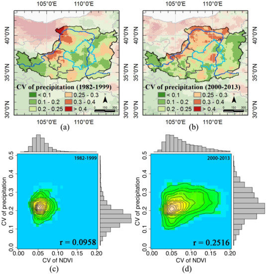 The CV of precipitation () over two periods (1982–1992 and 2000–2013) was examined. High values were observed in the northwestern Loess Plateau, and central Ningxia province during the first period (1982–1999); however, large areas showed high values, including the main areas that conducted GTGP projects (Figure 10a,b). was independent of during the first period, but was positively related to during the second period with a coefficient, r = 0.2516 (Figure 10c,d).