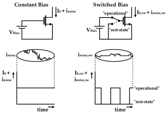Conceptual diagram of switched-biasing technique (reproduced with permission from the author, reducing MOSFET 1/f noise and power consumption by switched biasing; published by IEEE, 2000) [].
