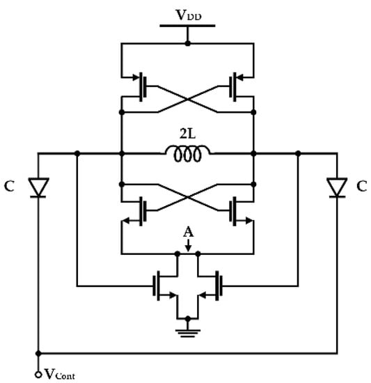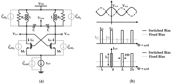 The reduction in the flicker noise is a major issue in VCO design using the CMOS process because the phase noise of the VCO is mainly determined by the noise in the low-frequency region []. Many studies have been conducted to improve the reduction in the CMOS VCO phase noise performance caused by the flicker noise. Biasing techniques for core transistors have been widely used to prevent the degradation of the VCO phase noise by the flicker noise of the oscillator core transistors [,]. A VCO using core transistors biased at class C operation is a representative technique that reduces the contribution of the flicker noise effect from the core transistor at the output [,,]. A resonant filter at the second harmonic also minimizes the noise effect from the core transistors, but the large chip size and the tuning range limit cause other issues in the design of the VCO using this technique []. The increase in the chip area can be reduced by implementing the filter using the common-mode resonance of the LC tank in a cross-coupled LC oscillator, although the issue of the tuning range limit cannot be solved [,,]. The performance degradation by the noise of the core transistors is reduced by these techniques, but the contribution of the flicker noise caused by the current source, which is used to constantly supply the DC bias current in the core transistors, remains in the output characteristics of the VCO. The flicker noise by the current source dramatically increases the close-in phase noise of the VCO owing to the nonlinear characteristics of the VCO []. A simple method to reduce the effect of the flicker noise from the transistors constituting the current source is to design the VCO using only voltage biasing, that is, without using any current sources [,]. However, the core current of the VCO can easily deviate from the designed value depending on the power supply variations when current biasing is not used. It can also be observed that the oscillator becomes more sensitive to ground noise []. A switched-biasing technique has been proposed to reduce the flicker noise effect of the current source based on the periodic behavior of the differential VCO [,]. The up-conversion behavior of the flicker noise of the current source can be fundamentally eliminated using the switched-biasing technique, which is based on the periodic operation of the differential VCO [].