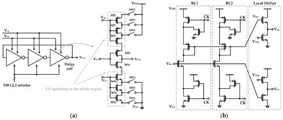 Yoshida et al. proposed a structure that digitally controls the current source of a ring-type VCO using a switched-bias circuit (SBC), which is depicted in Figure 4 []. As shown in Figure 4b, the SBC is composed of two-level shifters and two identical bias branches (BC1 and BC2) and is configured to operate alternately according to the clock (CK) signal applied from the outside. In the VCO core shown in Figure 4a, current sources divided into three bits are placed on each side of the delay cell, and their gate bias is switched to a modulated signal (Vcp and Vcn) formed through the SBC. In addition, all current sources are biased to perform a triode operation because the probability of trap−detrap is less than that of the saturation operation and less flicker noise is generated []. The clock frequency of the SBC was set to 10 MHz. The purpose is to suppress spurious occurrences at the switching frequency despite the simulation result that noise reduction below 100 kHz is independent of the clock frequency. Effectively utilizing the SBC, the ring VCO improves the noise performance by 3 dB at 100 kHz [].