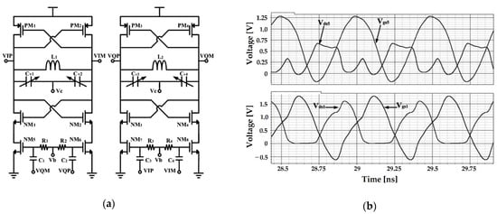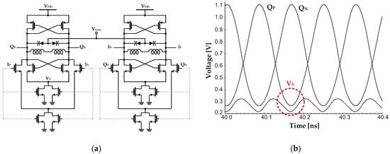 Jeong and Yoo proposed a method of applying switched-biasing to the current sources of each gm stage and the coupled input stage in a CMOS quadrature-VCO (QVCO), as presented in Figure 5 []. When applied to a conventional current source coupled QVCO, the switched-biasing technique can be applied to the current source shared by the coupled input stage and the gm stage. However, when the gm stage and the coupled input stage share a current source, the oscillation waveform and the common source node waveform are misaligned because of the resistance in the transistor triode region and parasitic capacitances in the common source node (shown as Vs in Figure 5a). In this design, the source nodes of the cross-coupled pair and the coupled-input pair are separated for optimal alignment, and the QVCO waveform is shown in Figure 5b. As a result, the oscillation amplitude increased by 0.3 V (peak-to-peak) compared to the structure that shared the current source. Compared to the constant bias current and shared-current source method, phase noise improvements of 17 dB and 10 dB were shown in the simulation, respectively. In the measurement results, an improvement in the performance of 10 dB by the switched-biasing technique was verified, compared to that of the shared-current source method [].