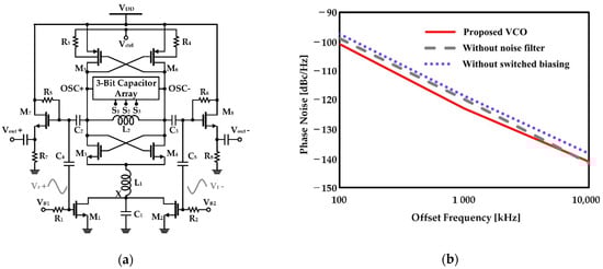 CMOS VCO with improved phase noise characteristics by adding a passive network: (a) schematic of the VCO; (b) phase noise of the VCO with the current source modulation and the noise filter (displayed as “proposed VCO”), the VCO using only the current source modulation (displayed as “without noise filter”), and the VCO using the constant bias voltage without the filter (displayed as “without switched biasing”) (reproduced with permission from the author, A 0.7-mW LC voltage-controlled oscillator leveraging switched biasing technique for low phase noise; published by IEEE, 2019) [].