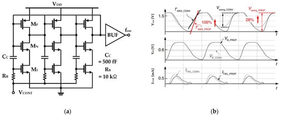 Lee and Im applied the switched-biasing technique in a simple inverter delay cell based ring oscillator, which is depicted in Figure 12 []. As shown in Figure 12b, by self-biasing the current source of the CMOS inverter, the slope of the output waveform increases, and, as a result, the flicker noise is reduced and the oscillation swing is improved []. Compared to the topology without self-biasing, an improvement of 7 dB at 100 kHz and 11.5 dB at 1 MHz was verified through simulation [].