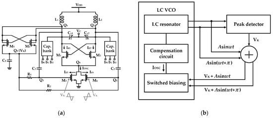 Min et al. suggested that the DC bias level of the current source can be adaptively adjusted according to the VCO oscillation amplitude by adding an auxiliary peak detector to the existing self-biasing topology, as shown in Figure 13 []. In this design, referring to Figure 13b, a separate cross-coupled pair (depicted in M5−M6 of Figure 13a) detects the negative peak of the oscillation waveform and induces charging to the capacitor (as shown in C1 in Figure 13a). The charged voltage (Vk) changes the DC bias level of the current source, solving the start-up issue of the oscillator, and simultaneously reducing the oscillator amplitude variability, mainly due to the Q-factor change of the capacitor bank within the tuning range and the process, voltage, and temperature (PVT) variation of the circuit. The phase noise using the switched-biasing technique was improved to approximately 6 dB at 100 kHz in the simulation, compared to that using the constant-biasing technique [].