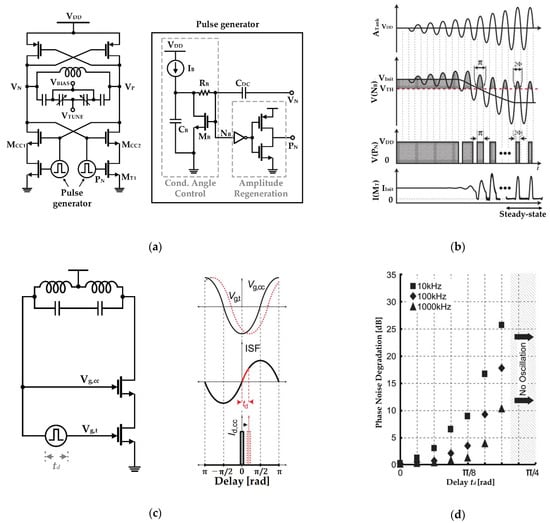 VCO employing the pulse generator that supplies pulse waveforms and the adaptive DC bias voltage: (a) schematic; (b) conceptual diagram of the VCO including the pulse generator operation; (c) intrinsic delay of the pulse generator; (d) simulated phase noise degradation with increasing the delay of the pulse generator (reproduced with permission from the author, A pulse-tail-feedback LC-VCO with 700 Hz flicker noise corner and −195dBc FoM; published by IEICE, 2019) [].
