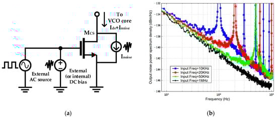 Characteristic of external-biasing topology: (a) conceptual schematic of external biasing (also available in PMOS configuration); (b) large noise peaks appearing as harmonics of the modulation frequency correlated with the external signal (reproduced with permission from the author, Experimental study on MOSFET’s flicker noise under switching conditions and modelling in RF applications; published by IEEE, 2001) [].