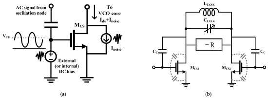 The self-biasing topology, which is a method using the coupled signal from the VCO output, has been proposed to solve the problem caused by the use of an external generator []. As the tail current source of the VCO in the self-biasing topology is modulated by the oscillation signal, the correlation between the modulation signal and the output can be achieved using easy implementation without additional circuitry. The current efficiency driving the VCO core can be increased by decreasing the conduction angle owing to the correlated AC modulation signal of the current source, based on the ISF theory [,]. In addition, the effect of the flicker noise of the current source is dramatically reduced in the self-biasing topology by the modulation frequency in the GHz band, which is higher than the flicker corner frequency. The DC bias voltage of the current source becomes an important design condition when the switched-biasing technique applies to the NMOS VCO using a low power supply voltage of 1.2 V or less. The efficiency of the switching operation is generally determined by the DC bias voltage, which is set near the threshold voltage because the current modulation should be exhibited by a small-sized switching signal. The DC bias of the current source in the initial research stage using the switched-biasing technique was set to the same biasing state as before the AC modulation of the source. However, the bias was changed to the threshold voltage of the current source transistor for clearly switching the on-off states of the current flow due to AC modulation [,,]. The DC bias near the threshold voltage may not sufficiently supply the driving current for VCO operation, because the biasing current is generated at the sub-threshold region of the current source transistor, as shown in Figure 16a. In addition, it is difficult to apply to commercial circuits as operation reliability problems of the current source may occur owing to the PVT variation. Because the thermal noise produced from the voltage source for setting the DC bias can degrade the phase noise of the VCO, a method for reducing the contribution of the thermal noise should be applied to the circuit design for supplying the DC bias []. The capacitance of the resonator in the VCO is increased by the output coupling lines for self-biasing, as depicted in Figure 16b, and the resonance frequency of the LC tank can be affected by this increase. The coupling capacitor CC in Figure 16b, which determines the amplitude of the modulation signal, should be generally designed to be higher than the parasitic capacitance of the current source [,]. The frequency shift due to the additional capacitances becomes an important factor in designing the high-frequency VCO because the total reactance in the LC tank decreases as the oscillation frequency increases. Above all, the major problem in DC biasing near the threshold voltage of the current source is that the current source does not operate in the saturation, and the common node of the VCO does not achieve a high impedance. Low impedance at the common node may cause the deduction of the phase noise as more noise from the switching operation of the current source affects the VCO core []. The effect on impedance reduction at the common node by DC biasing near the threshold voltage may be minimized as proposed by the previous studies, which include the method of splitting the current source into several transistors, the method of using a source degeneration capacitor, and the method of implementing an additional filter for noise reduction [,,,,].