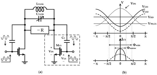 Shasidharan et al. proposed a structure in which the switched-biasing technique is applied to a Class-C CMOS VCO, as shown in Figure 11 []. In this design, a source degeneration capacitor to suppress flicker noise of a cross-coupled pair and an auxiliary −gm stage to compensate for insufficient negative gm were constructed. A current source using PMOS transistors was used to make a low impedance path, and an effective switching operation was achieved by the biasing at the sub-threshold voltage. Moreover, by adjusting the size of the current source appropriately, the parasitic capacitance Cin was designed to be an even-mode harmonic filter of the common node (VCM1−2 in Figure 11b). As it was designed to have a narrow conduction angle of 0.31π through simulation, the phase noise characteristic shows an improvement of 14 dB in the performance at 1 MHz offset compared to the case where the switched-biasing technique was not applied [].