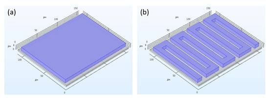 The proposed design uses the thermistor principle to measure the change in air temperature. In order to accomplish optimal results and performance, the proposed design was verified for different materials, different thermistor thicknesses, and shapes. The first layer represents a very thin substrate made of glass material. Glass has a very low thermal conductivity, which is 100 times smaller than that of silicon. Low thermal conductivity is essential for preserving unwanted heat loss to the substrate and the surroundings of the sensor. The second layer is the thermistor which is the most crucial and important layer of the design. In our designing steps, we have considered three main variables, thermistor shape, size and material. At first, we tested two different shapes as shown in Figure 2, where (a) is a rectangular shape and (b), is a serpentine shape.