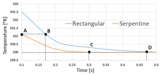 Temperature vs. Time for different shapes: rectangular and serpentine.