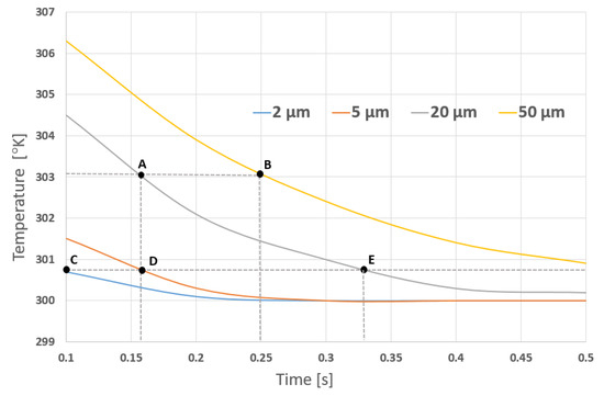 After deciding the shape, the design is verified at different thicknesses. Figure 4, shows the simulations for different thermistor thicknesses. Points A and B show the response time of the sensor using different thicknesses at 303.1 degrees kelvin. Points C, D and E show the response time of different thicknesses at 301 degrees kelvin. It can be observed that, the heat transfer to the thermistor decreases as the thickness increases. As a result, we chose a thickness of 5 m. Lastly, after we have selected the best performing shape and thickness, we simulated the design for different materials. The following simulation has a fixed shape and thickness where the changing variable is the material.