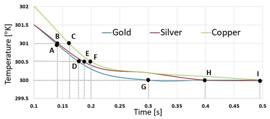 As observed in Figure 5 points A, B, and C show the response time for each of the materials at 301 degrees kelvin. Points D, E and F show the response time for each material at 300.5 degrees kelvin, and points G, H and I show the response time for each material at 300.5 degrees kelvin. We can observe that the best response is from gold.