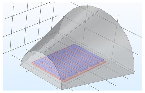 The last layer represents the air surrounding the sensor and the substrate. We have tried to mimic the inside of the nose shape, which has a cylindrical shape as shown in Figure 6. The red region represents the glass substrate; the blue region represents the serpentine shape thermistor made of gold with a thickness of 5 m.; the outer region in grey represents the air.