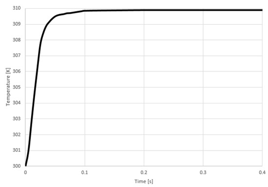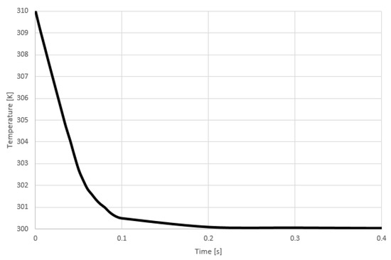 Figure 8, shows the exhaling process where the air flows from the inner part of the nose towards the nasal entrance. It can be observed that inhaling or exhaling results in a temperature change of around 10 degrees kelvin. It was observed from the simulation results, that the signal stabilizes after 0.2 s, which is considered as the response time of the system.